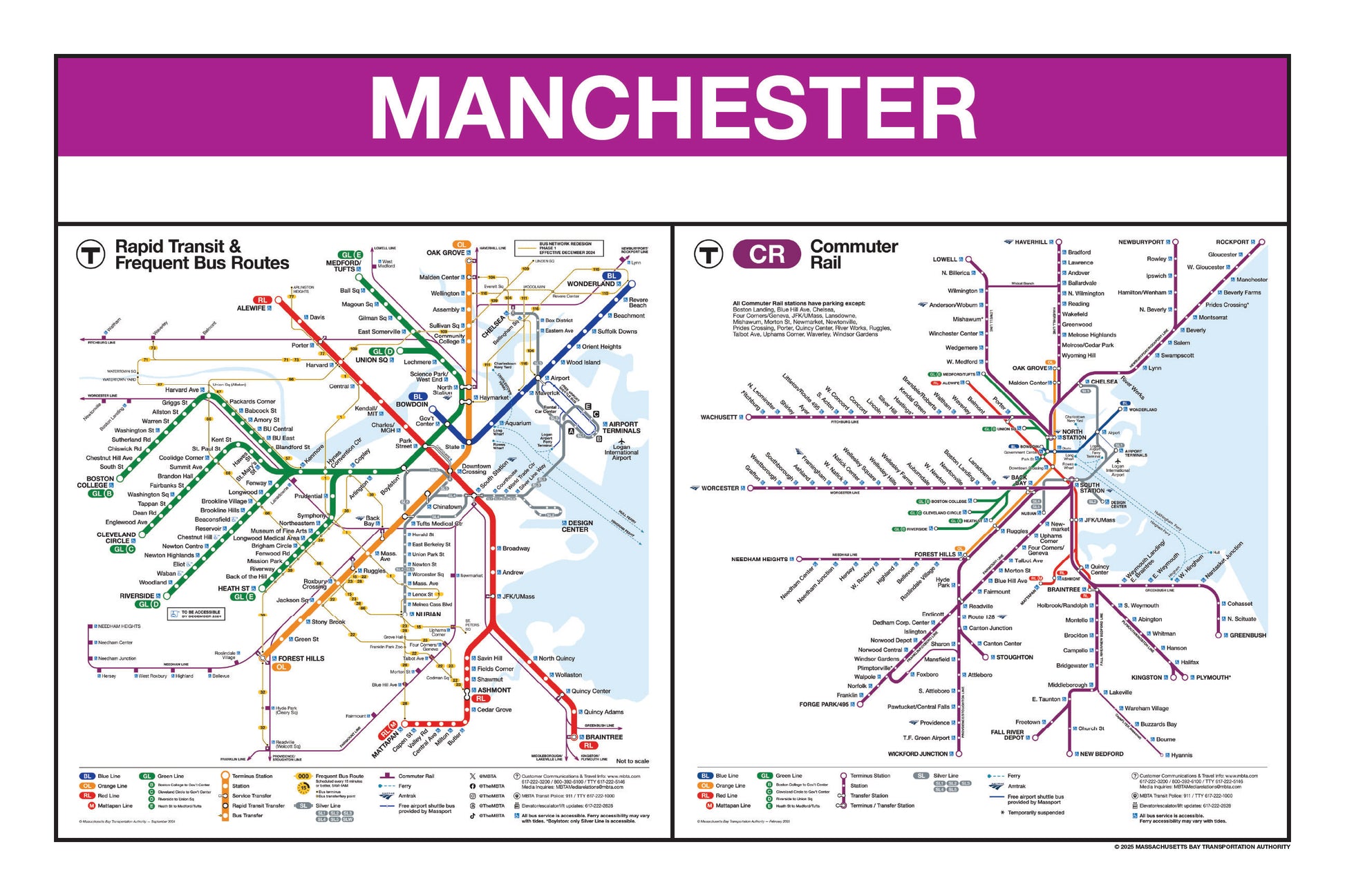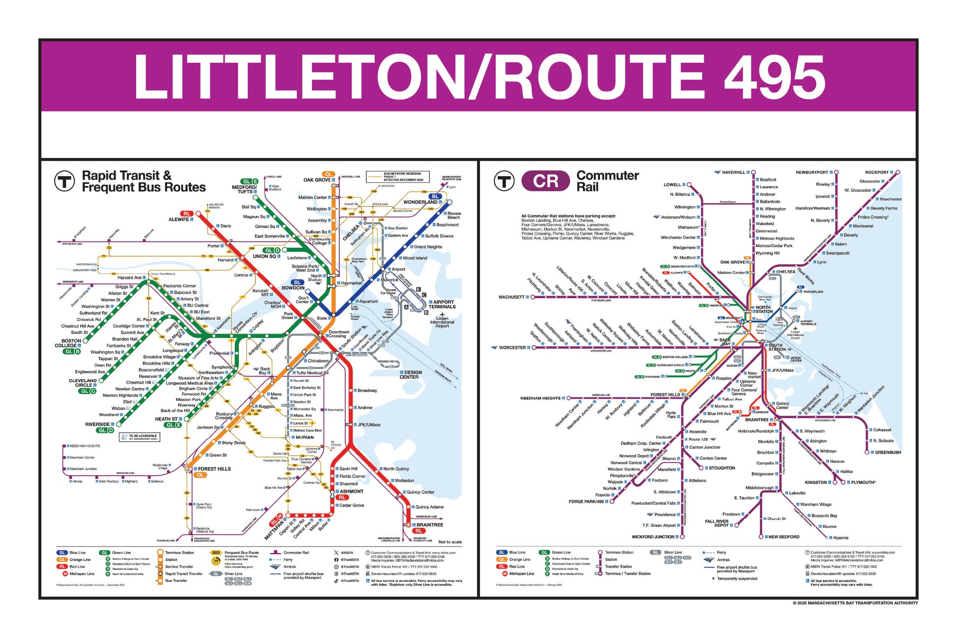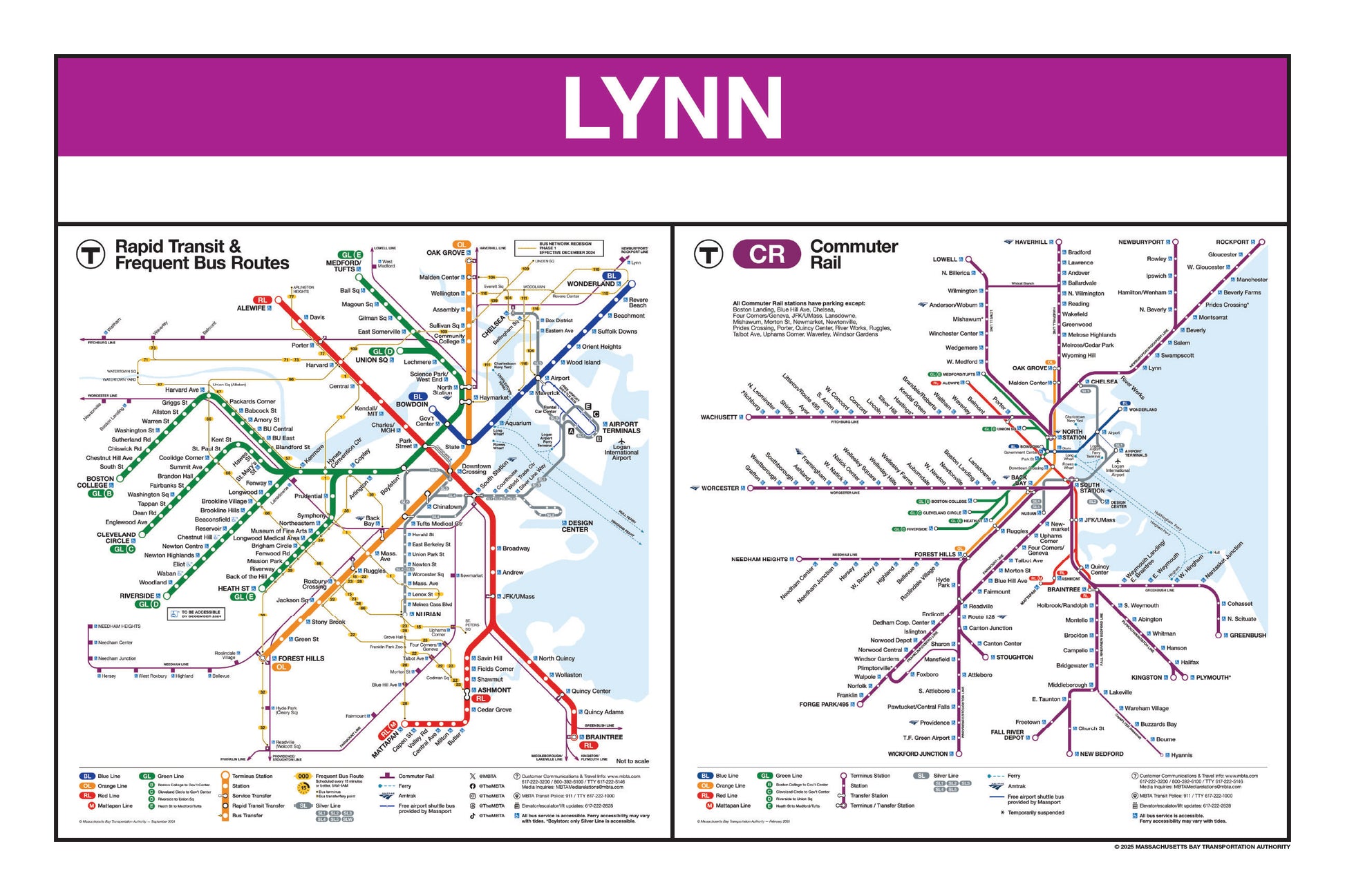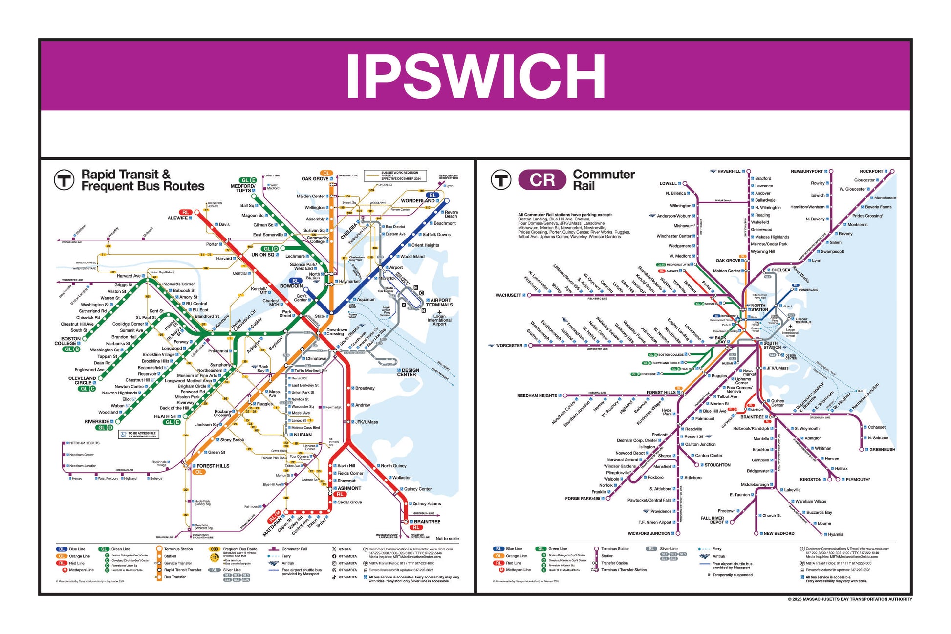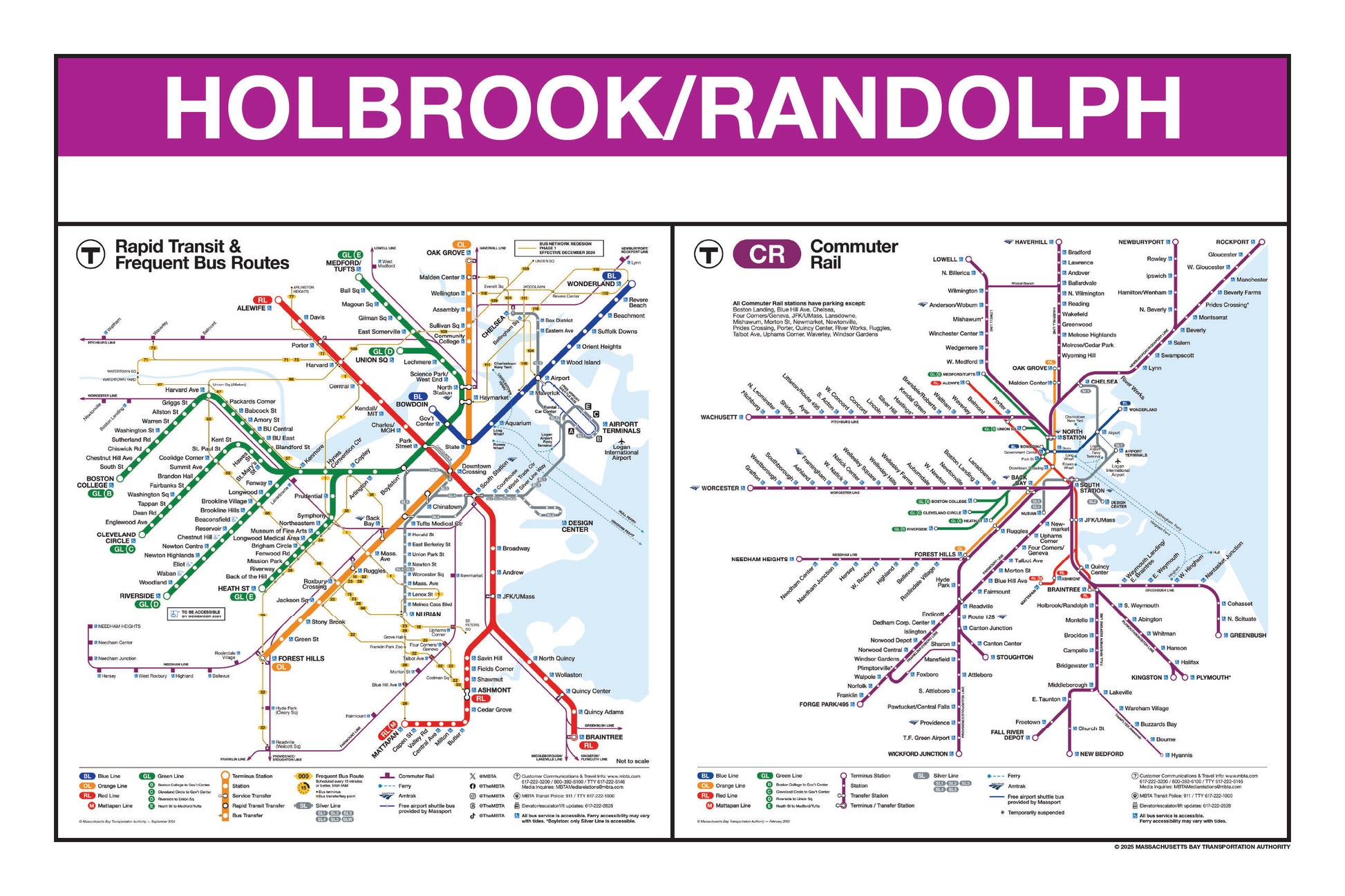 Choose a station name from the list and a print will be made for that station. The selected station name will be printed on the top portion in white on a purple background. Each print will feature the MBTA 2024/2025 Rapid Transit with Frequent Bus Routes Map alongside the 2025 MBTA Commuter Rail System Map.