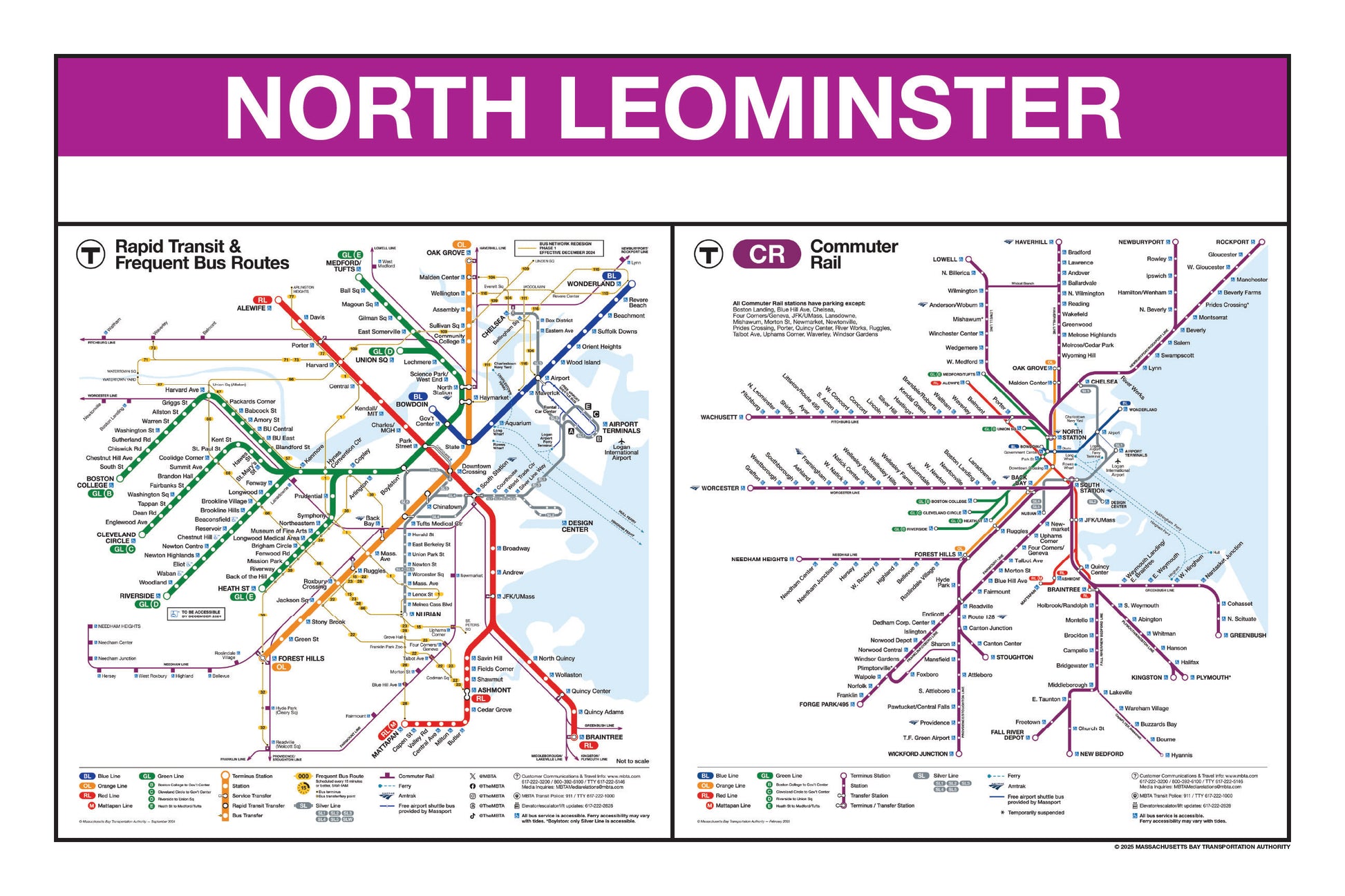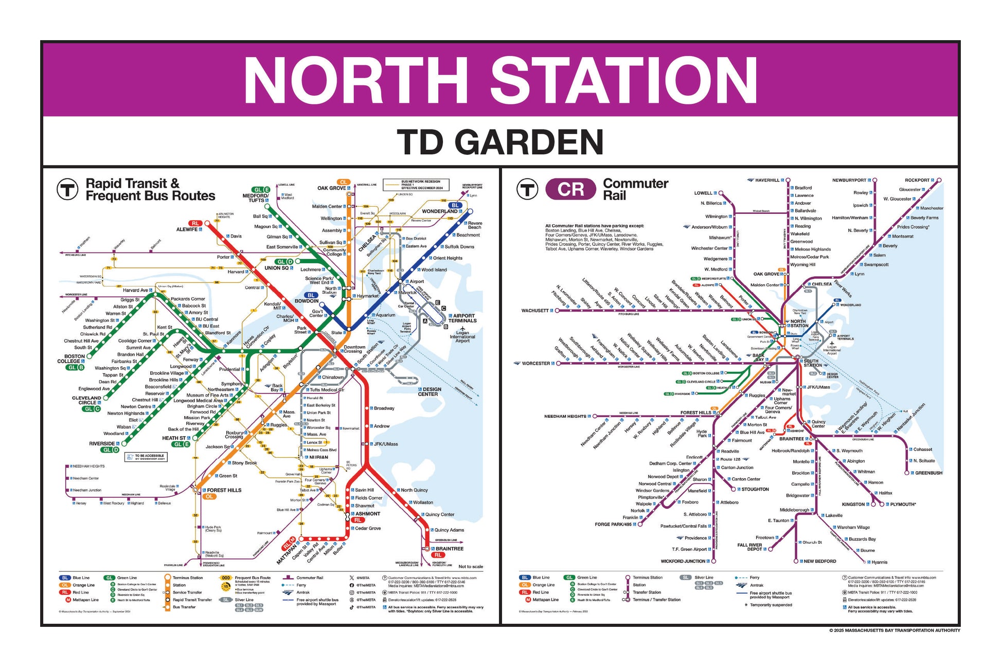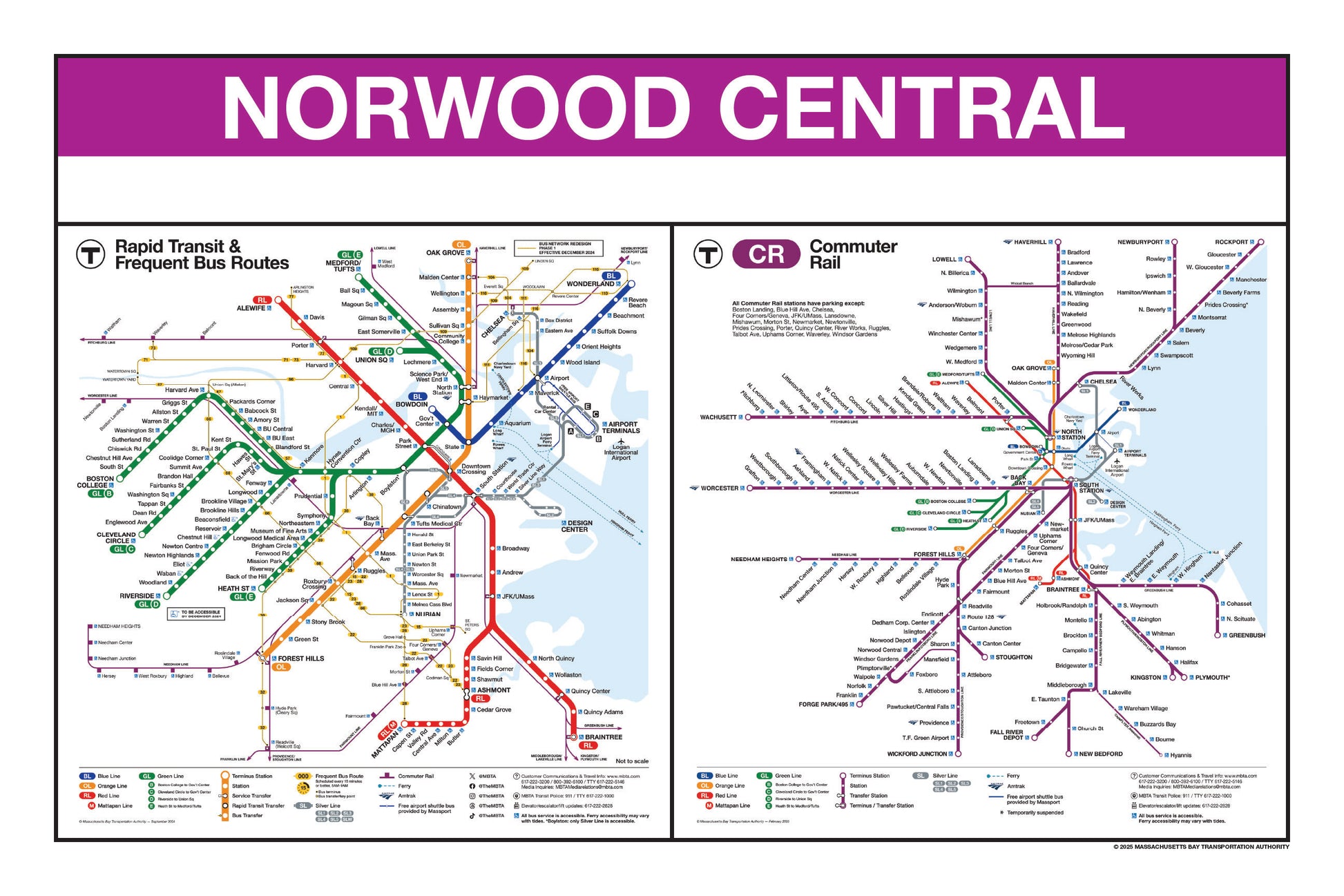 Choose a station name from the list and a print will be made for that station. The selected station name will be printed on the top portion in white on a purple background. Each print will feature the MBTA 2024/2025 Rapid Transit with Frequent Bus Routes Map alongside the 2025 MBTA Commuter Rail System Map.