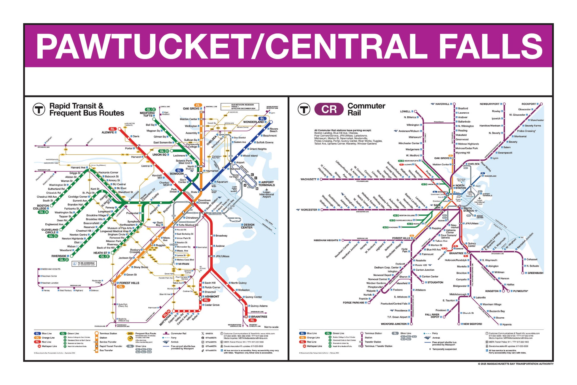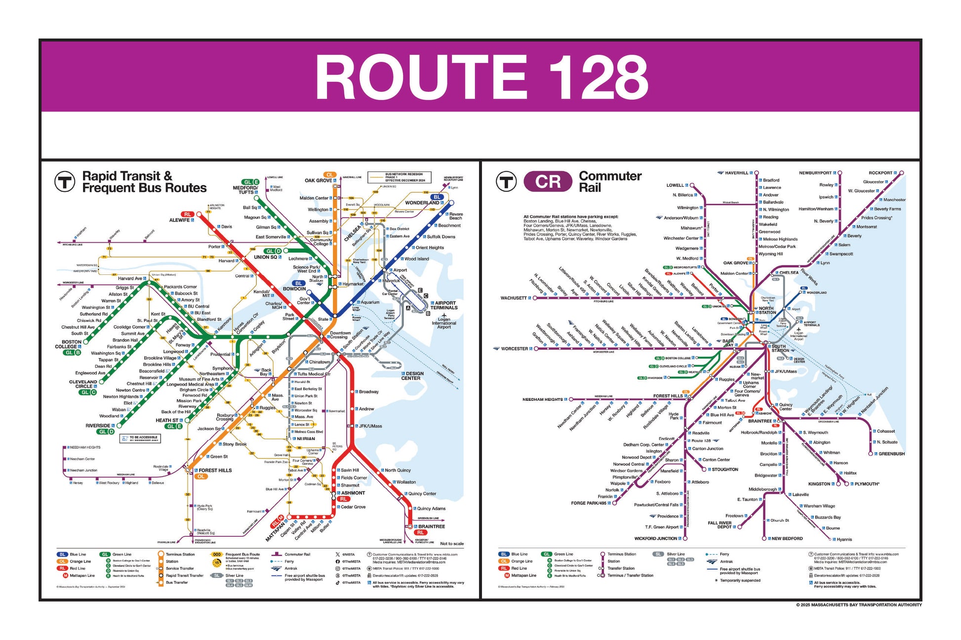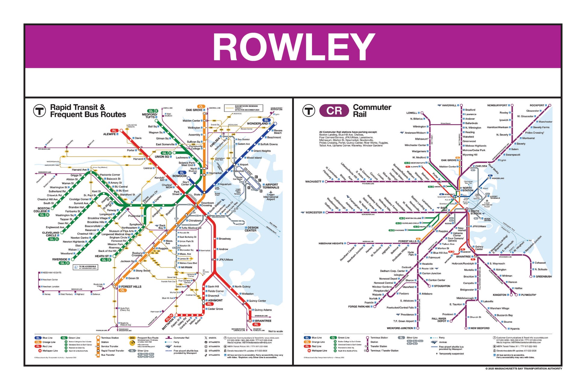 Choose a station name from the list and a print will be made for that station. The selected station name will be printed on the top portion in white on a purple background. Each print will feature the MBTA 2024/2025 Rapid Transit with Frequent Bus Routes Map alongside the 2025 MBTA Commuter Rail System Map.