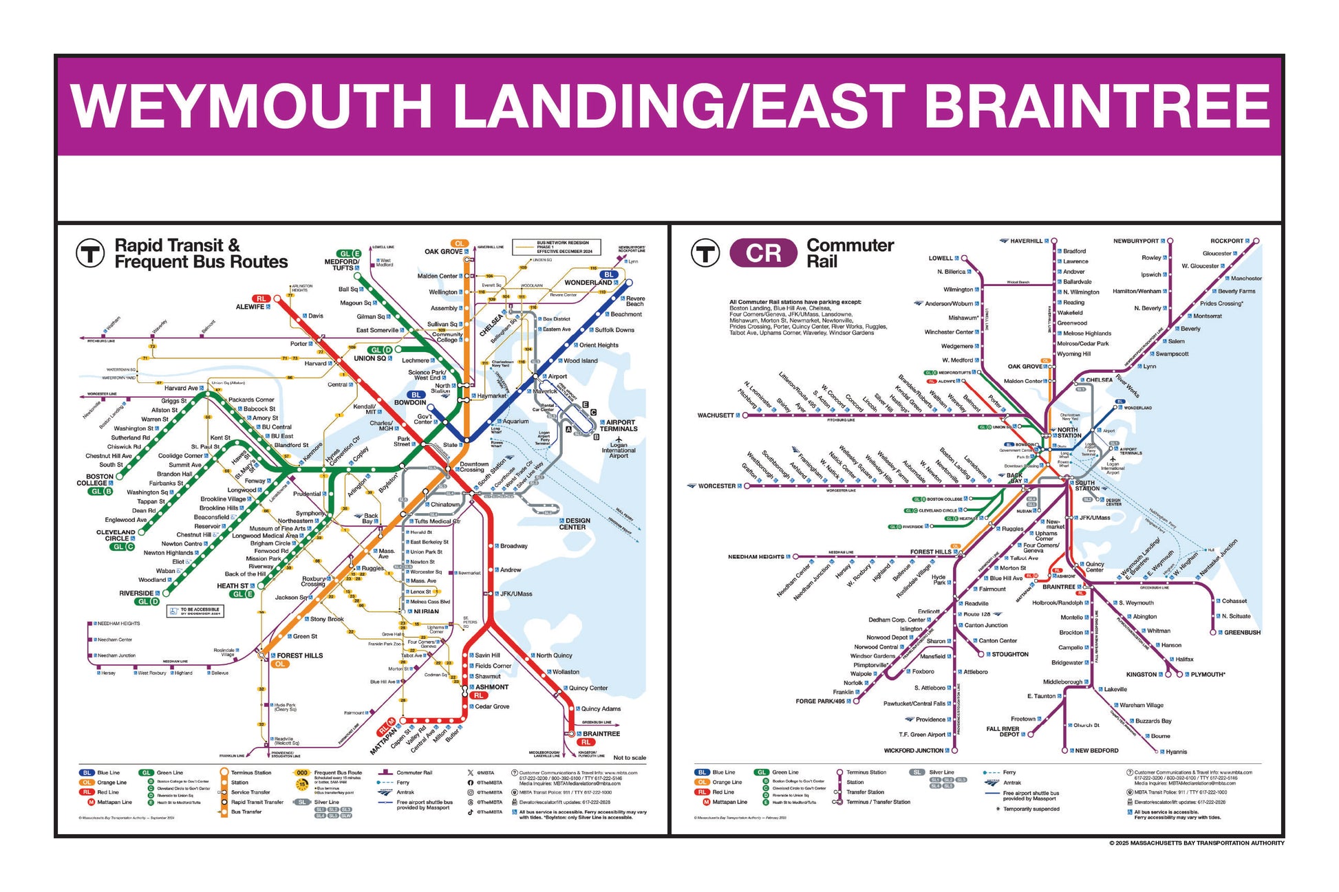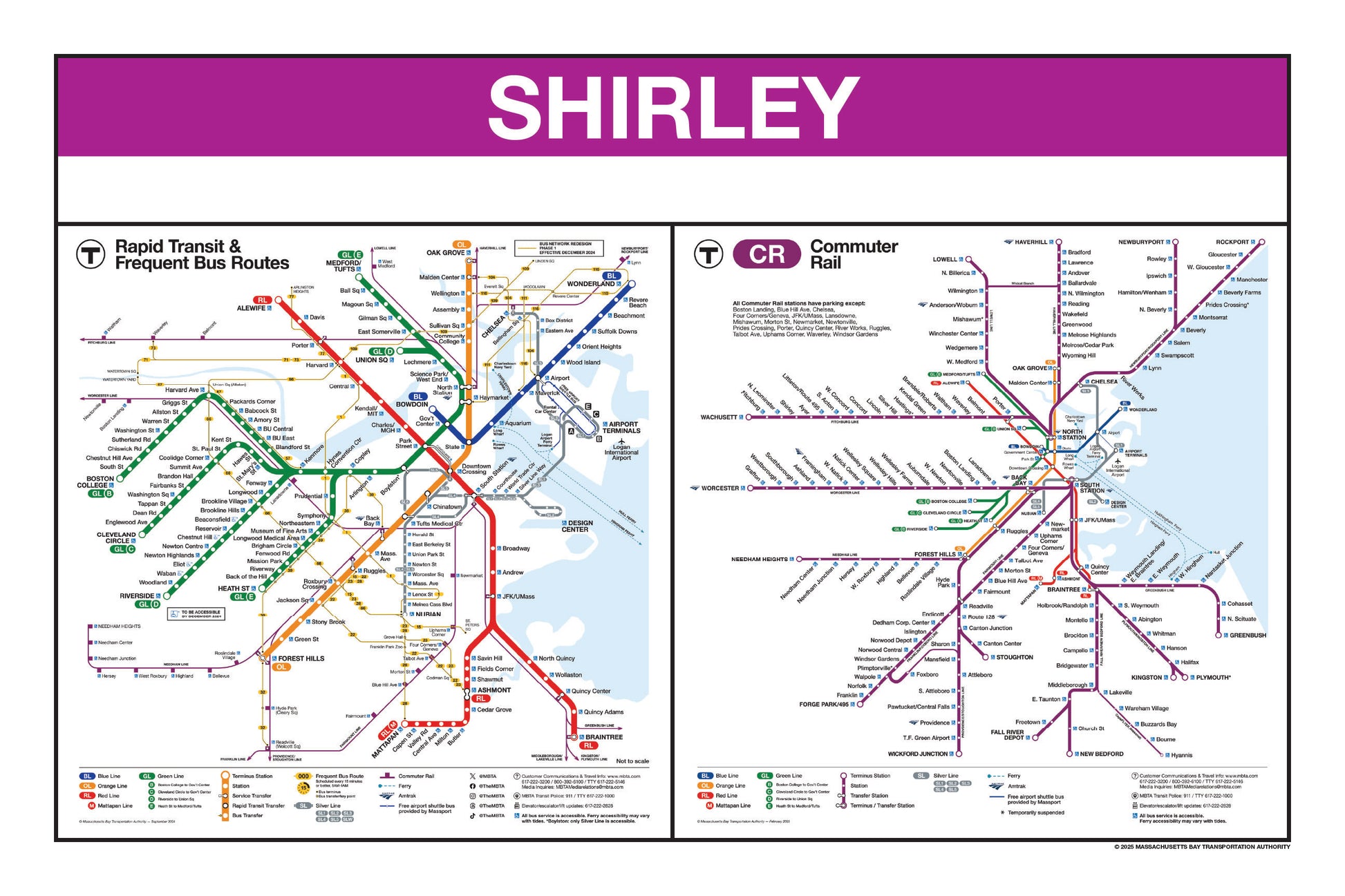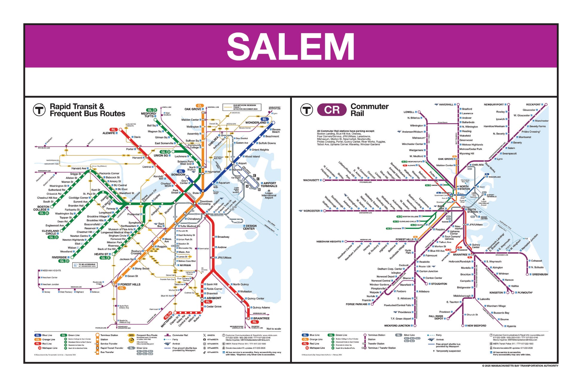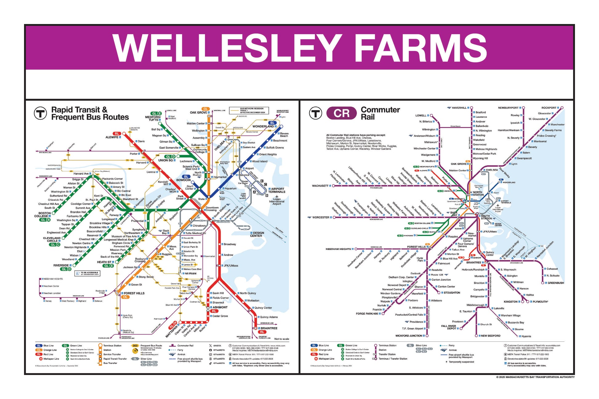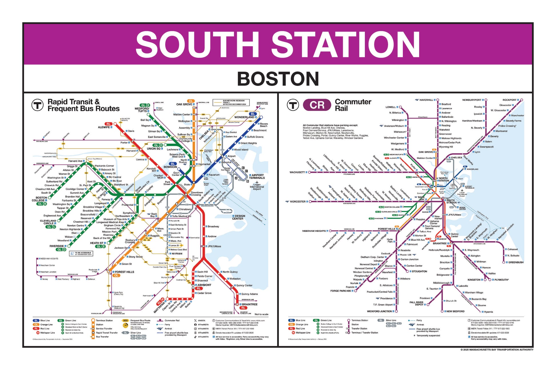 Choose a station name from the list and a print will be made for that station. The selected station name will be printed on the top portion in white on a purple background. Each print will feature the MBTA 2024/2025 Rapid Transit with Frequent Bus Routes Map alongside the 2025 MBTA Commuter Rail System Map.