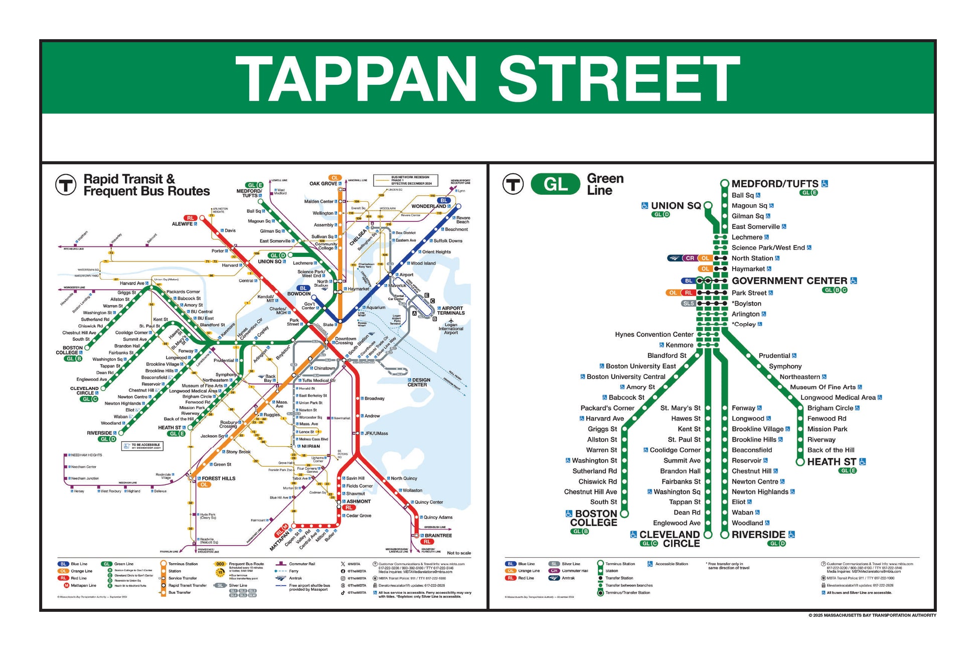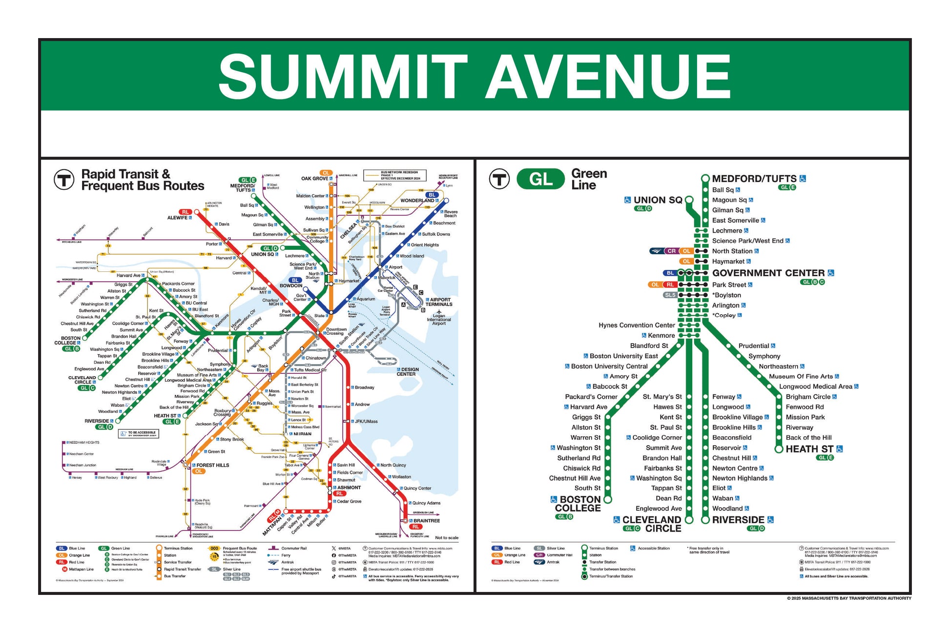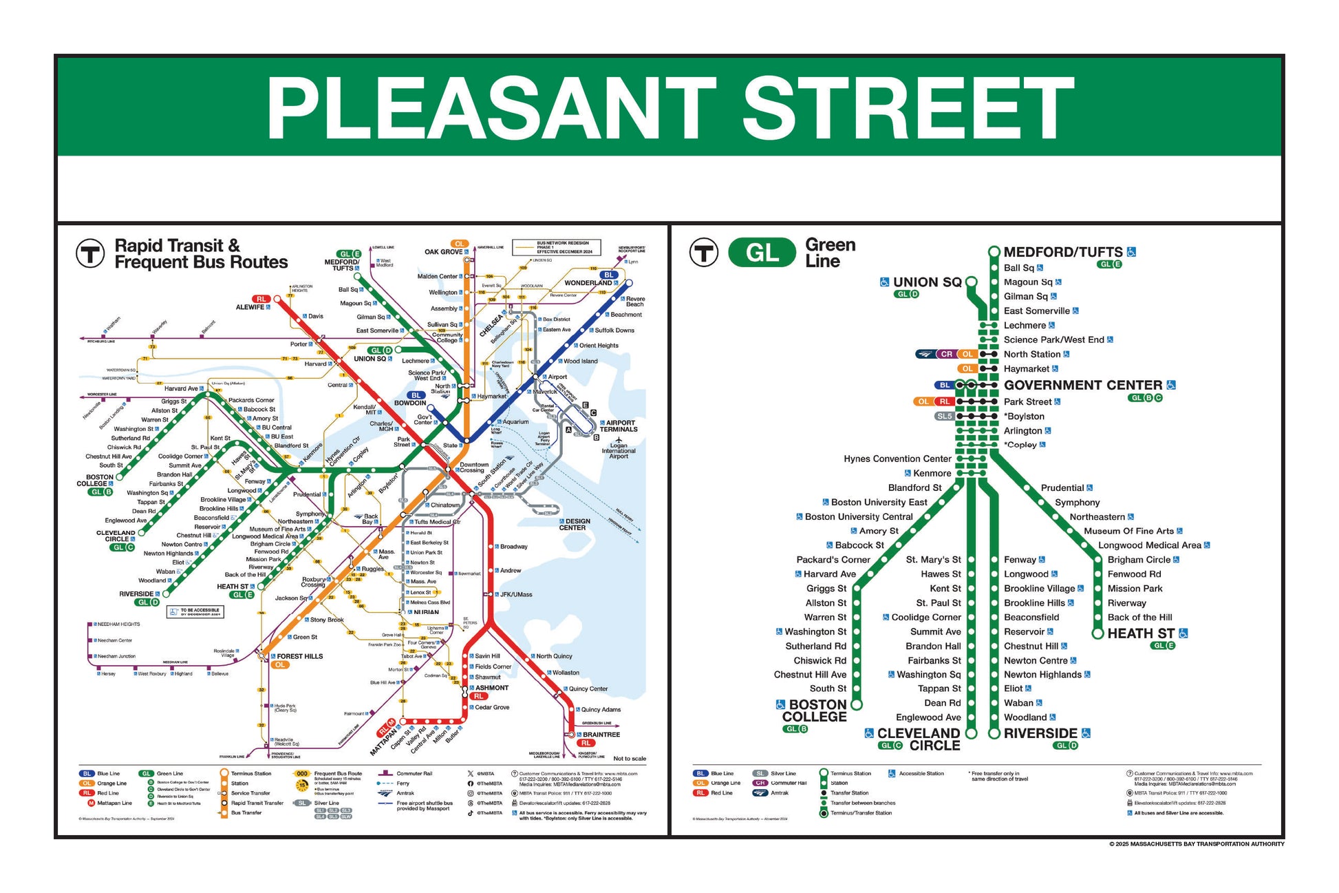Choose a Green Line station name from the button list below and a print will be made for that station. This page lists stations names that begin with I through Z. Station names that begin with A through H are listed on a separate page. Each print will include the 2024/25 MBTA Rapid Transit Map & Frequent Bus Service Map as well as the 2024/25MBTA Green Line Map.