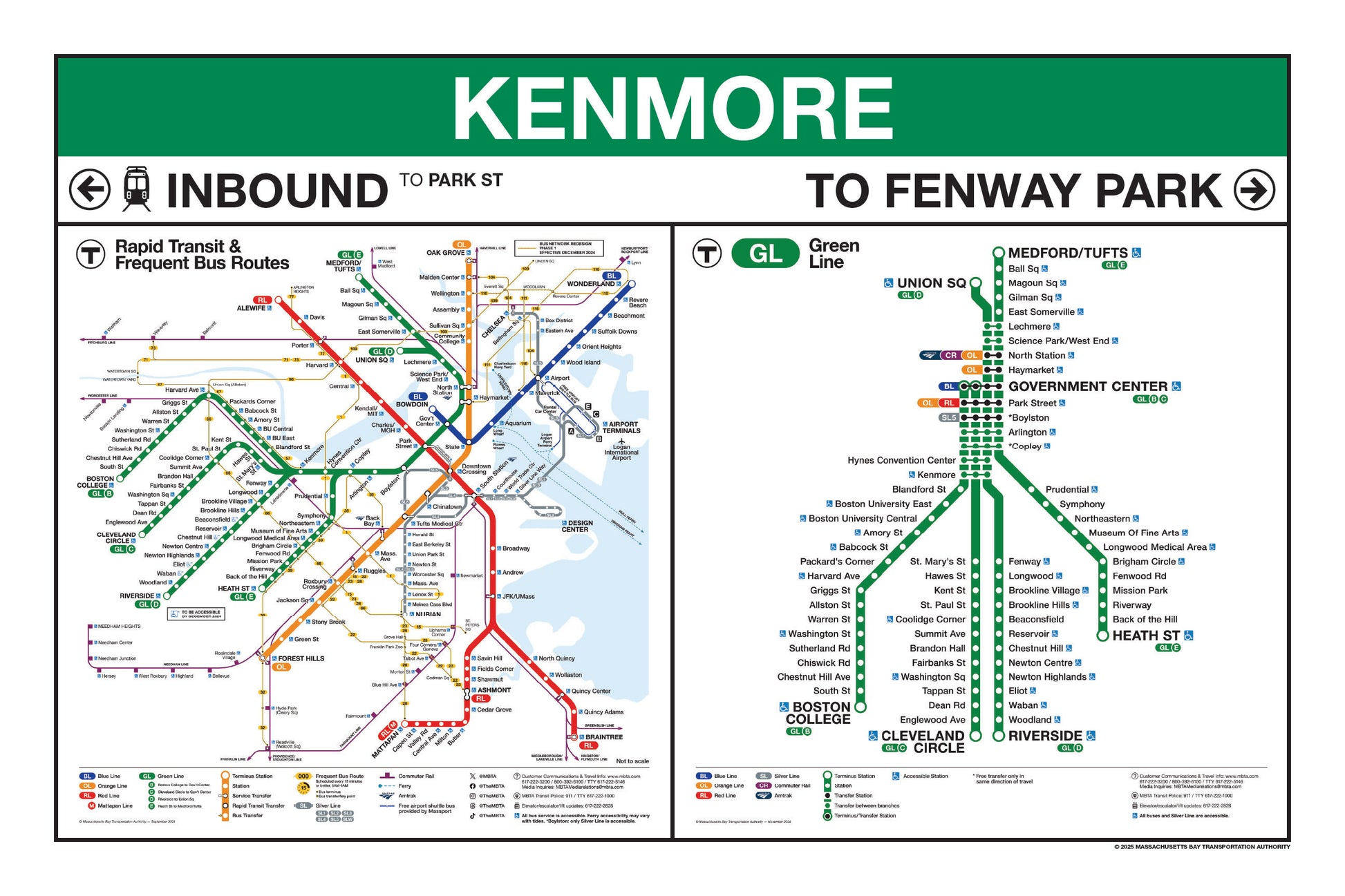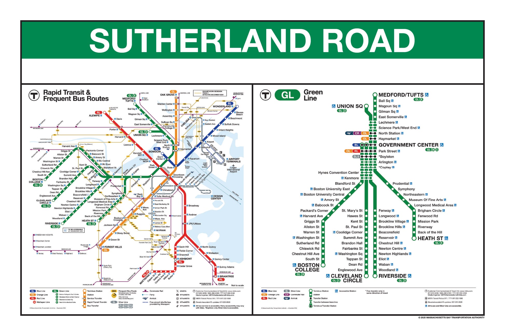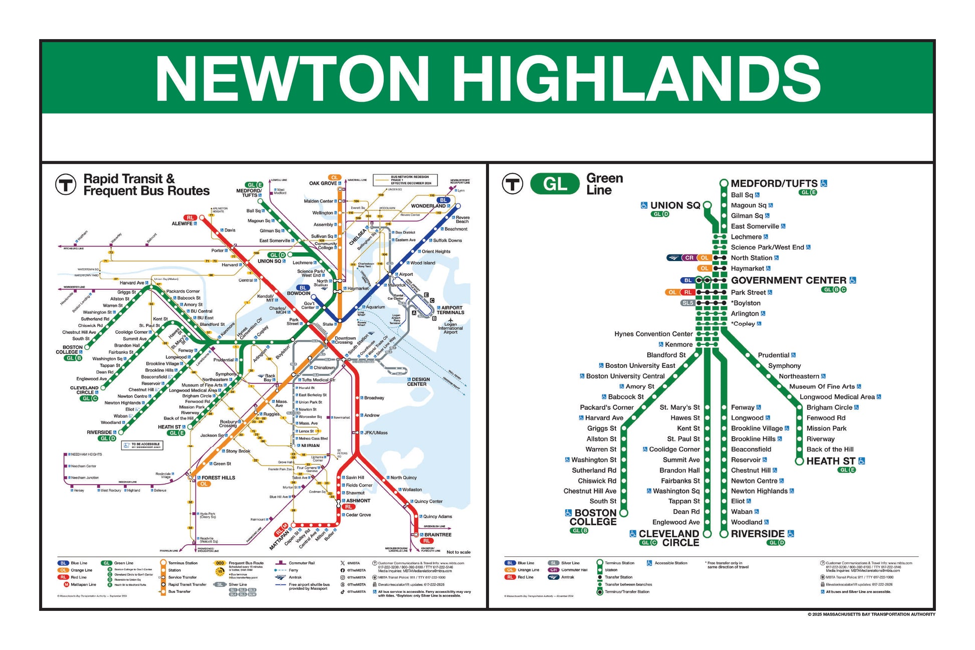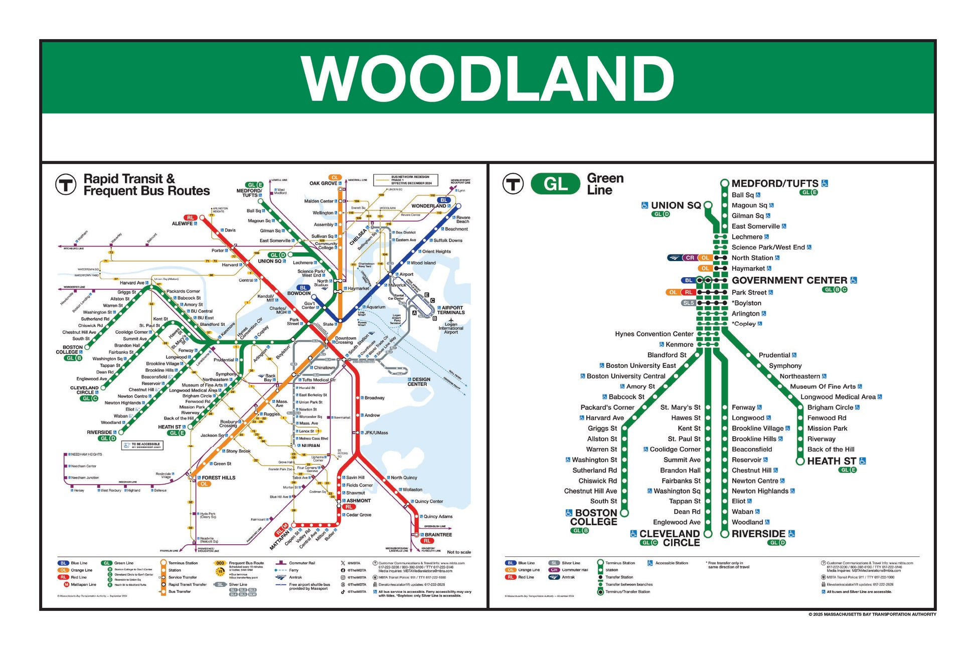 Choose a Green Line station name from the button list below and a print will be made for that station. This page lists stations names that begin with I through Z. Station names that begin with A through H are listed on a separate page. Each print will include the 2024/25 MBTA Rapid Transit Map & Frequent Bus Service Map as well as the 2024/25MBTA Green Line Map.