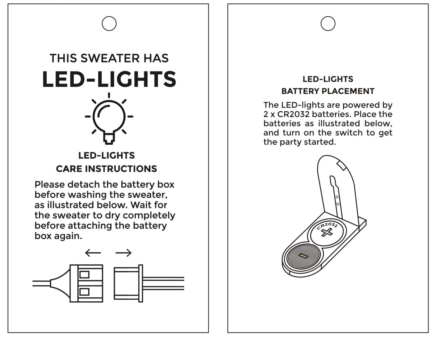 How do I care for the sweater? Sweater is machine washable with cold water and delicate cycle. Be sure to remove battery box and batteries before washing! See image.