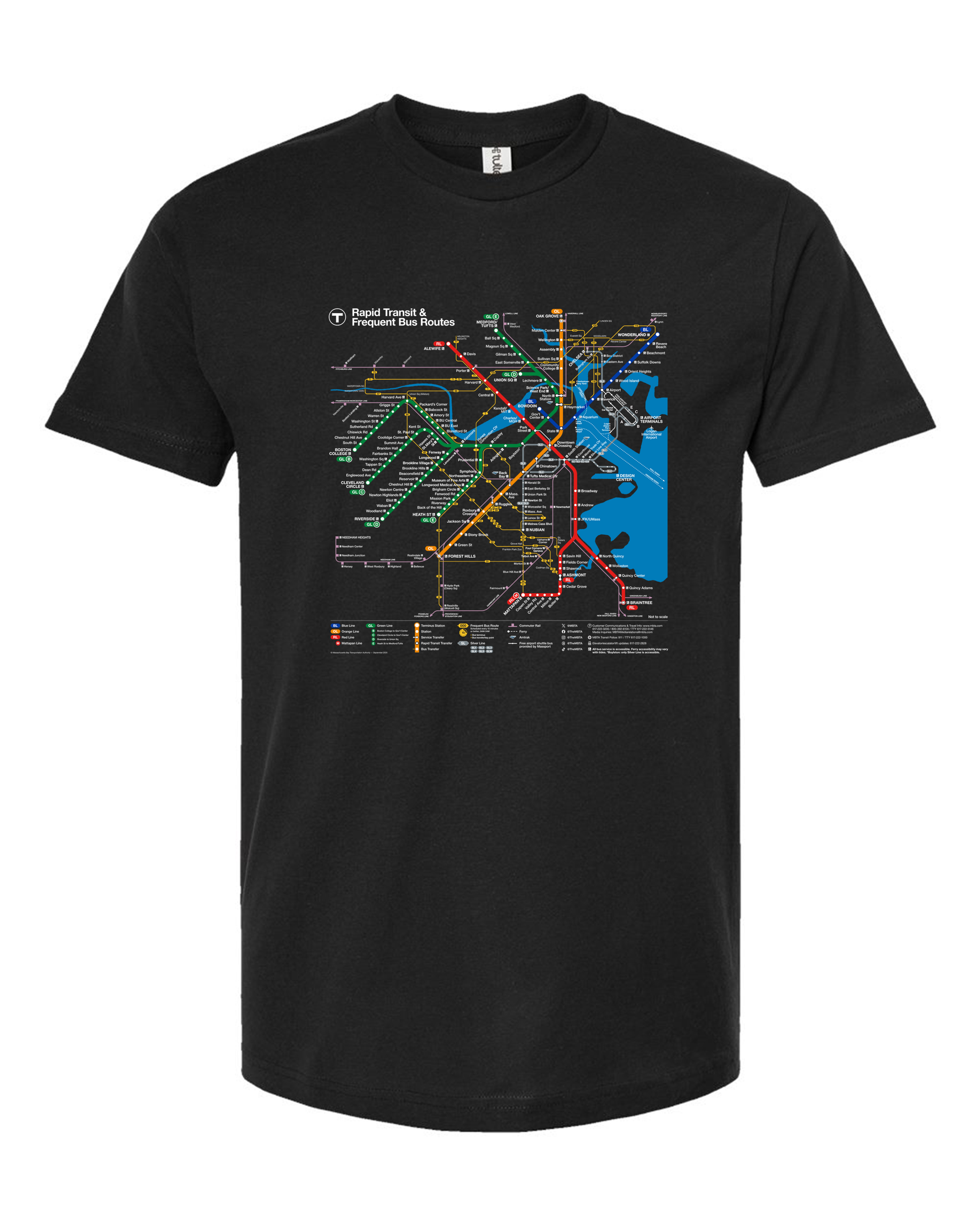 Black short sleeve shirt features the MBTA Rapid Transit and Frequent Bus Routes Map printed in full color. All of the details including station names are featured.