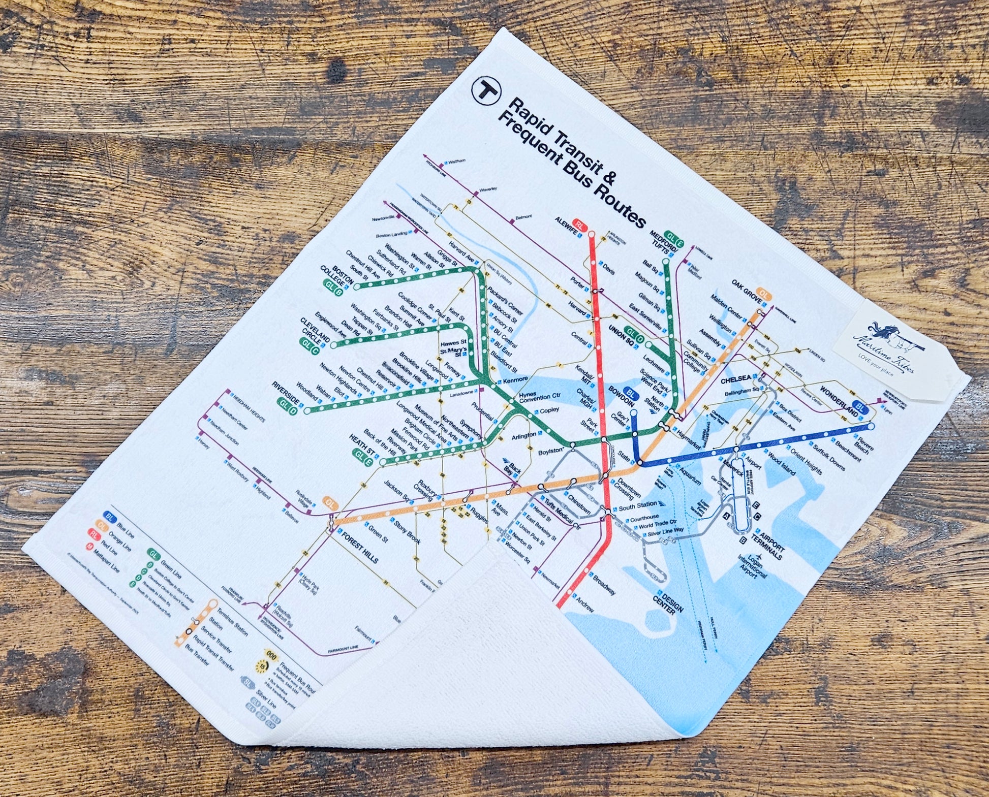 The MBTA's Rapid Transit & Frequent Bus Routes Map is printed in full color on this white hand towel.