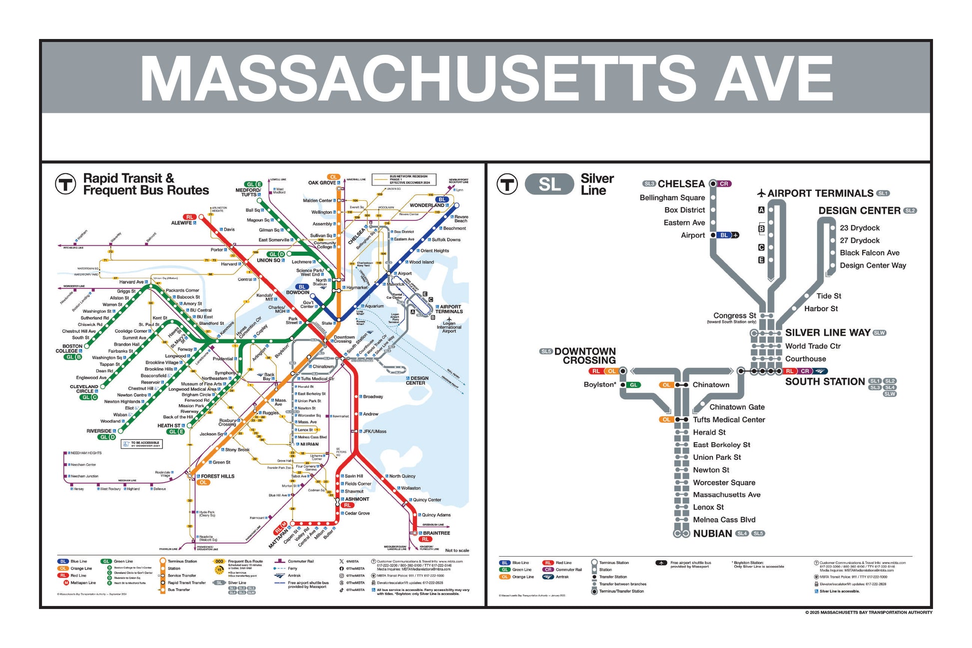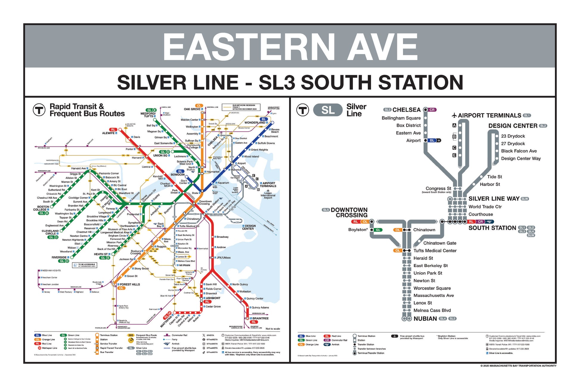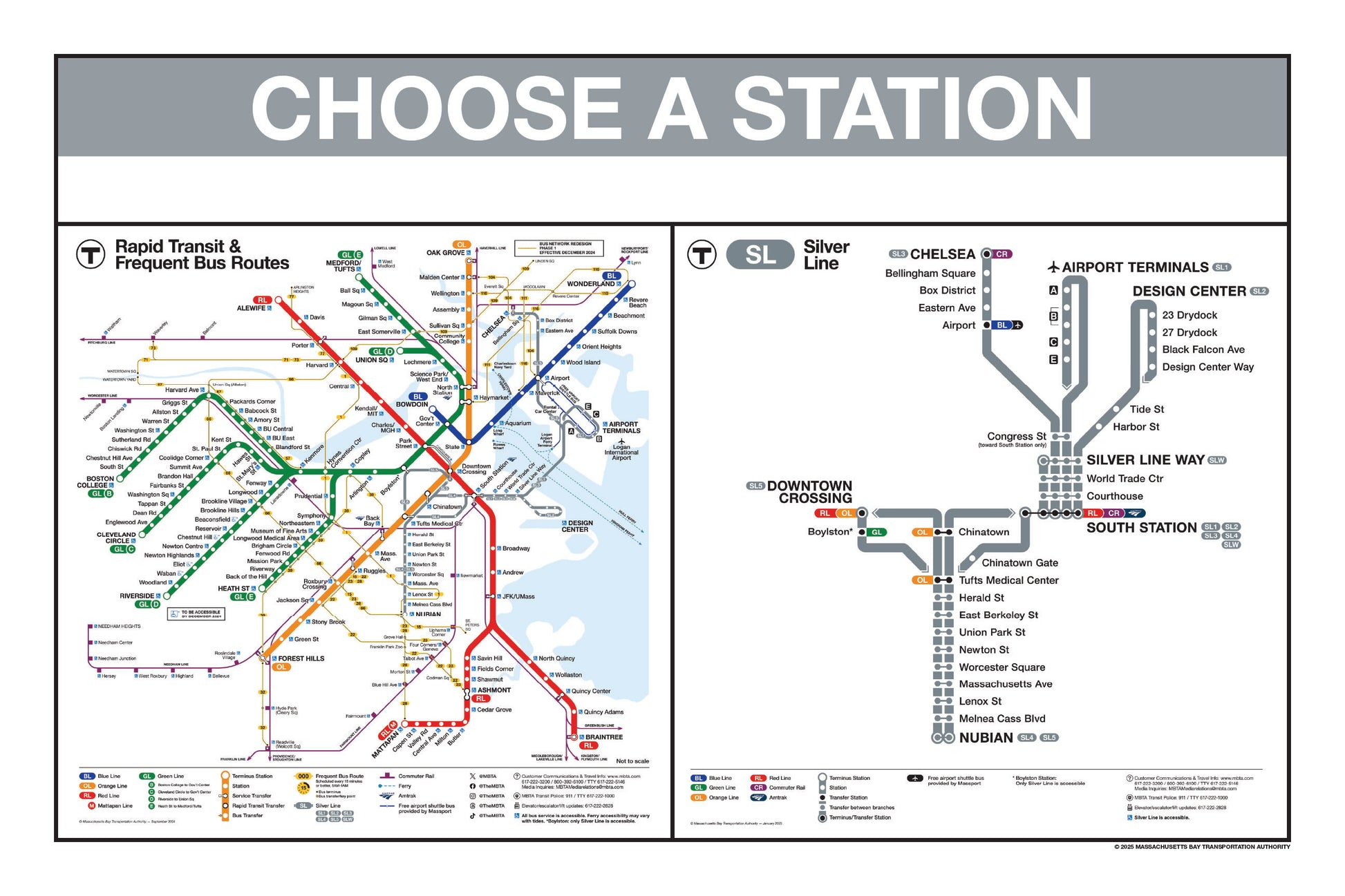 Choose a Silver Line station name from the button list below and a print will be made for that station. Each print will include the 2024/25 MBTA Rapid Transit Map & Frequent Bus Service Map as well as the 2024/25MBTA Silver Line Map.