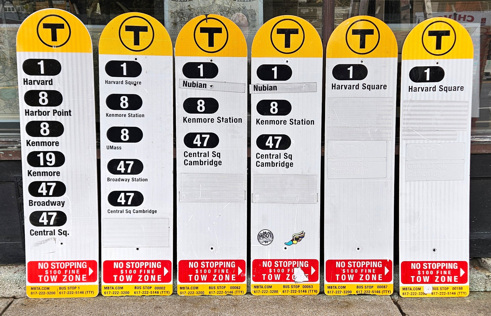 Decommissioned MBTA Bus Stop Signs: 1 Harvard; 8 Kenmore; 47 Broadway; 47 Central, etc.