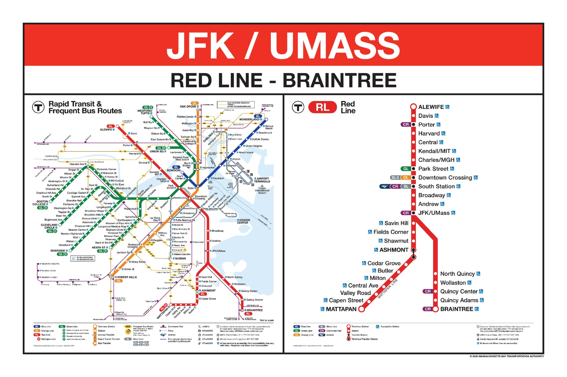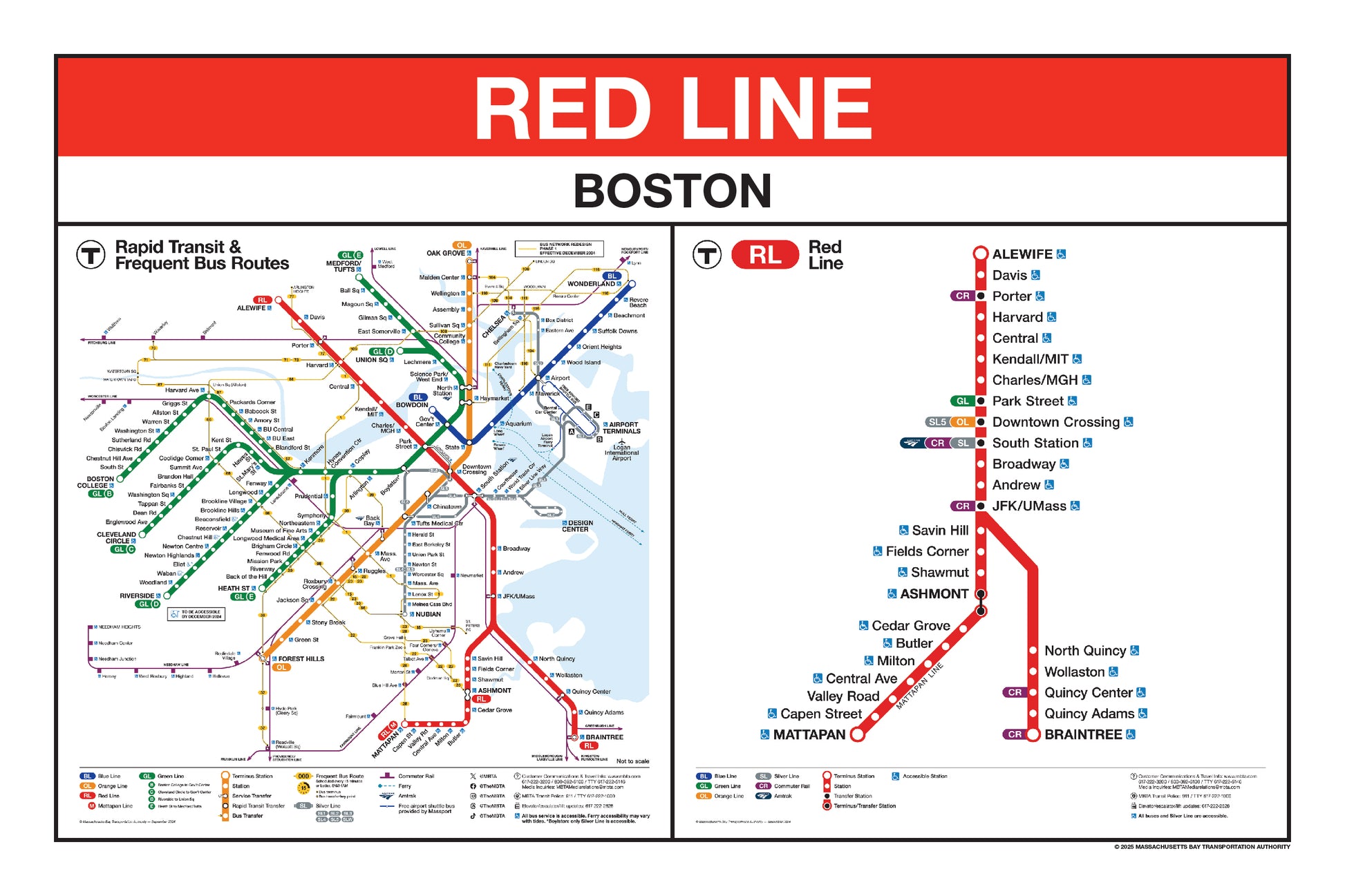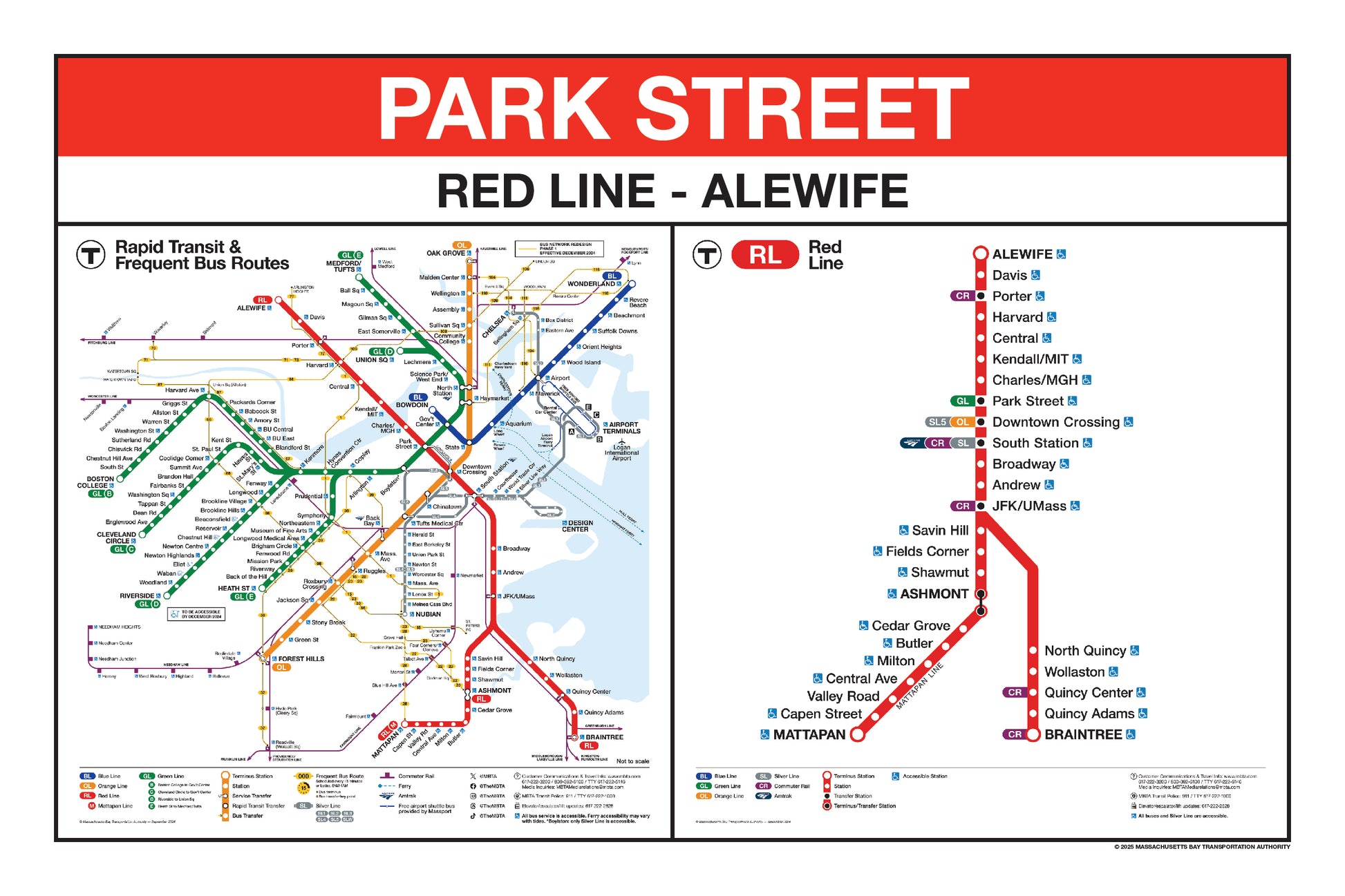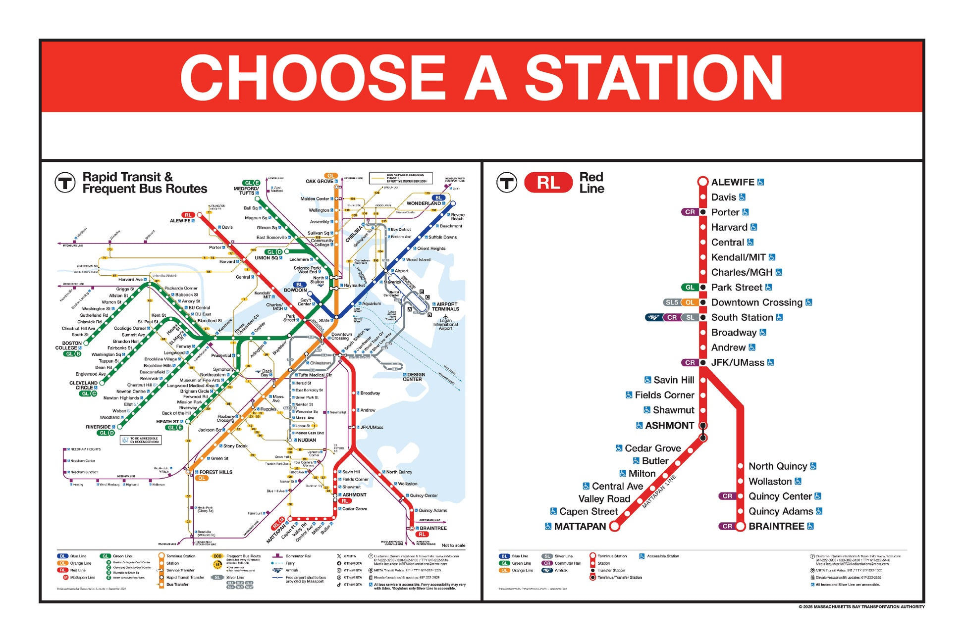 Choose a Red Line station name from the button list below and a print will be made for that station. This page lists stations names that begin with K through Z. Station names that begin with A through J are listed on a separate page. Below the station name, each print will include the 2024/25 MBTA Rapid Transit Map & Frequent Bus Service Map and the 2024/25 MBTA Red Line Map.