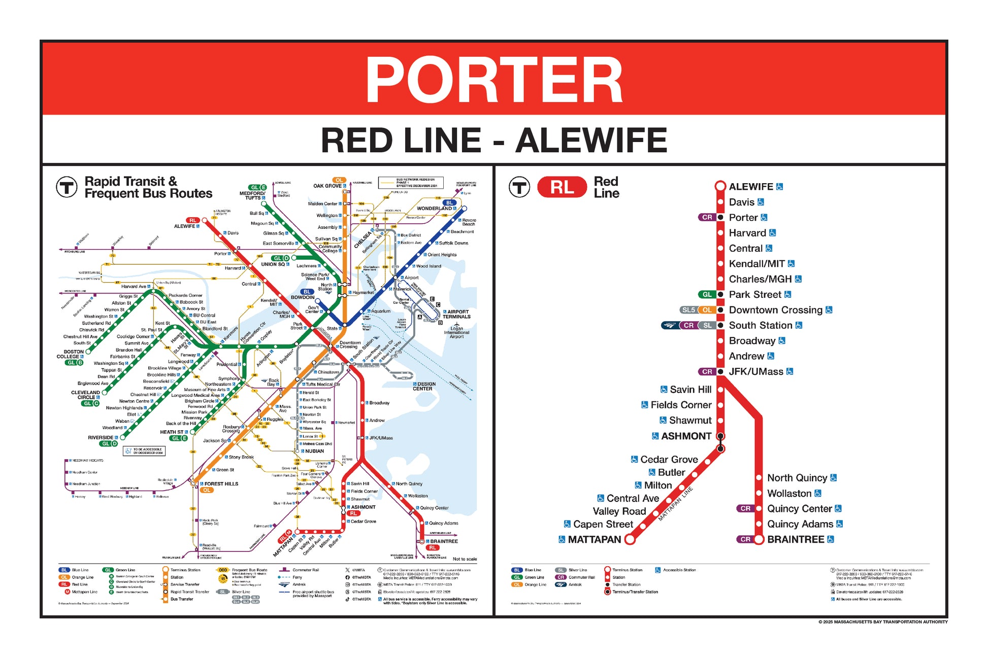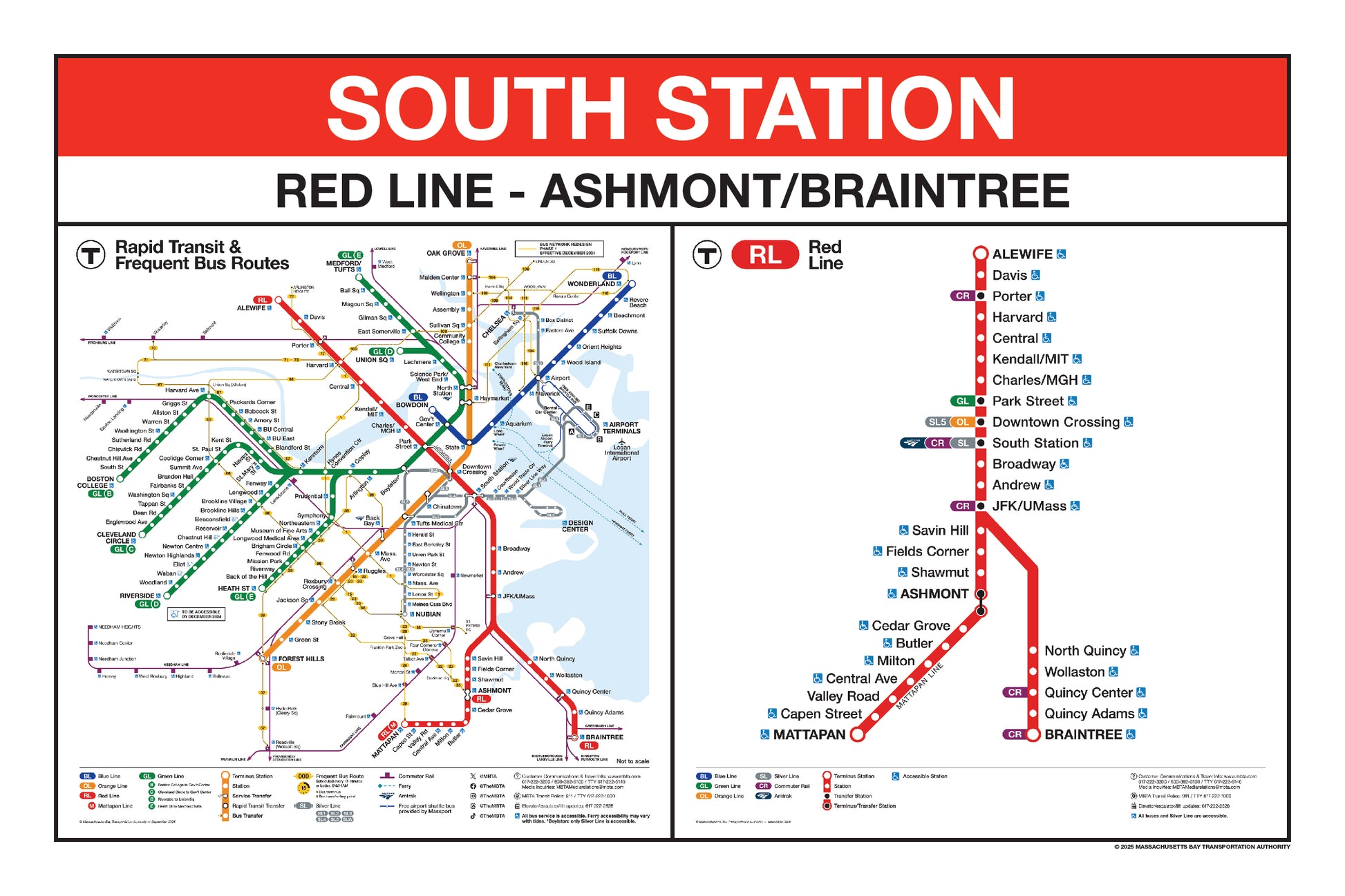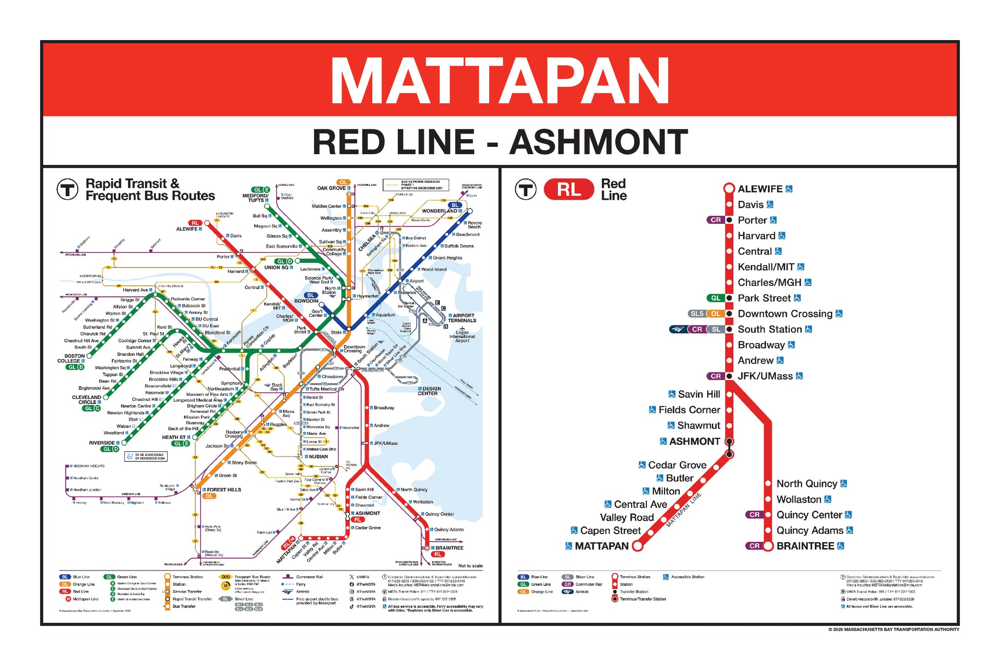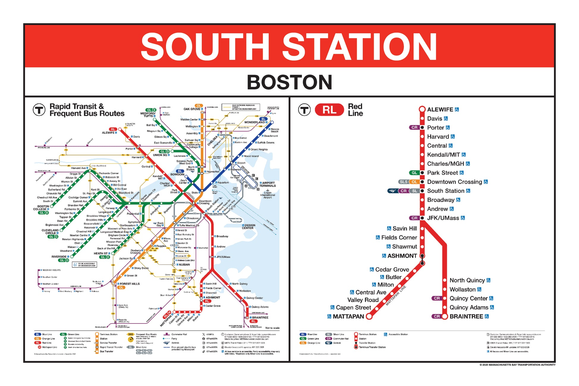 Choose a Red Line station name from the button list below and a print will be made for that station. This page lists stations names that begin with K through Z. Station names that begin with A through J are listed on a separate page. Below the station name, each print will include the 2024/25 MBTA Rapid Transit Map & Frequent Bus Service Map and the 2024/25 MBTA Red Line Map.