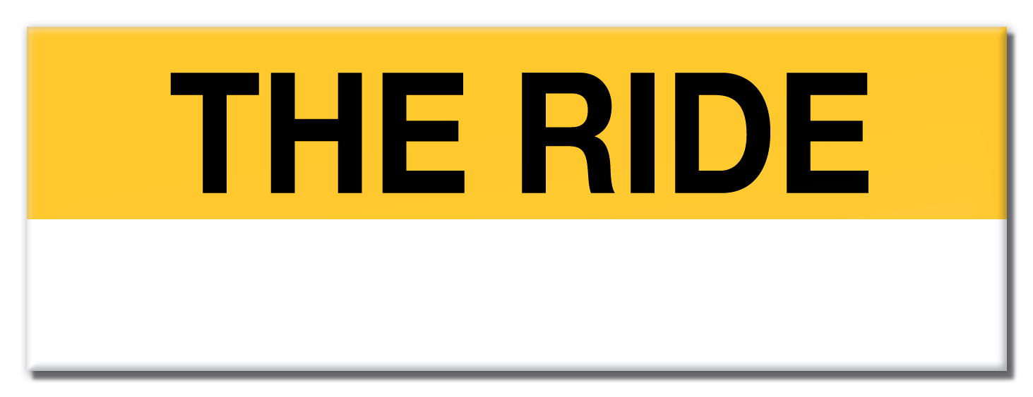 This magnet features THE RIDE in black text on a yellow background over white space.
